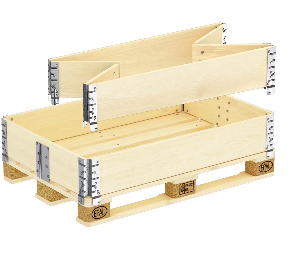 圍板箱側板用木板應四面創光,無毛刺。木板所用鋸材的材質指標允許限度可參考GB/T153-1995選為一等,即活節與死節最大尺寸不得超過材寬的25%,任意材長lm范圍內個數不得超過6個;腐朽面積不得超過所在材面面積的2%;裂紋夾皮長度不得超過材長的10%;蟲眼任意材長1m范圍內的個數不得超過4個;鈍棱最嚴重缺角尺寸不得超過材寬的20%;彎曲橫彎最大拱高不得超過水平長的0.5%,順彎最大拱高不得超過水平長的2%;斜紋傾斜程度不得超過10%。側板可以用兩塊木板槽梅拼接,但離縫應小于0.5mm。